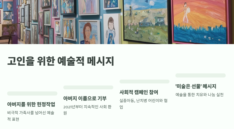 “솔비 부친상은 그저 비극적인 가족사가 아니다”라는 말처럼, 그녀는 아버지를 위한 헌정작업을 이어가고 있다. 2021년부터는 아버지 이름으로 기부도 이어가고 있으며, 실종아동 캠페인, 난치병 어린이와의 협업 전시 등을 통해 ‘미술은 선물’이라는 메시지를 전하고 있다.