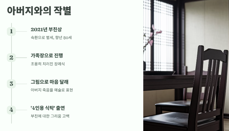 솔비 부친상 소식은 지난 2021년 조용히 알려졌다. 당시 소속사는 "솔비 아버님이 숙환으로 별세하셨다"고 전했으며, 장례는 가족장으로 조용히 치러졌다. 향년 80세. 그녀는 이후 아버지의 죽음을 그림으로 풀어내며 마음을 달랬다. 최근 방송된 '절친 토큐멘터리 - 4인용 식탁' 예고편에서는 부친에 대한 그리움이 묻어나는 고백이 전파를 탔다.