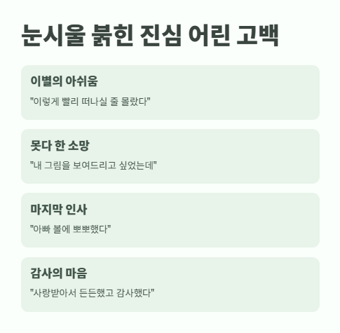 그녀는 "그림을 보여드리고 싶었는데, 돌아가셔서 슬프다"며 감정이 북받치는 모습을 보였습니다.
