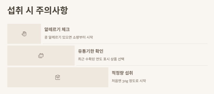 콩 알레르기가 있는 경우 주의가 필요해요. 처음엔 소량 섭취로 테스트하는 걸 추천해요.