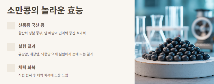 소만콩은 최근 건강식품계에서 주목받는 신품종 국산 콩으로, 항산화 성분이 풍부해 암 예방과 면역력 증진에 효과적이라고 알려져 있어요. 특히 유방암, 대장암, 뇌종양 억제 실험에서도 눈에 띄는 결과가 나왔고, 저도 직접 섭취해 본 후 확실히 체력 회복에 도움을 느꼈어요.