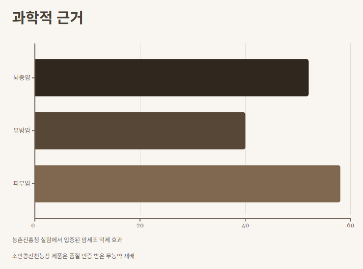 자료를 찾아보니까 농촌진흥청 실험에서 뇌종양 52%, 유방암 40%, 피부암 58% 정도 암세포 억제 효과가 입증됐다더라고요.