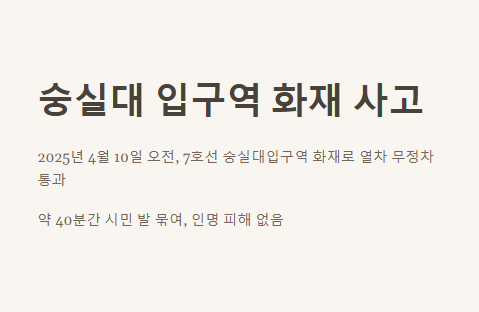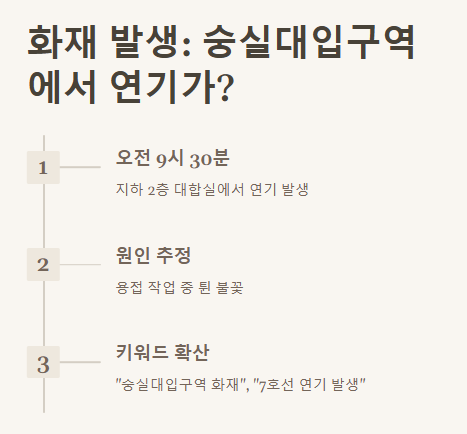 이 사고는 “숭실대입구역 화재 발생”이라는 키워드로 빠르게 확산됐으며, 이후 “7호선 숭실대입구역 연기 발생”, “숭실대 입구역 무정차 통과”, “서울 지하철 7호선 사고” 등 다양한 표현으로 시민들 사이에서 언급되었습니다.