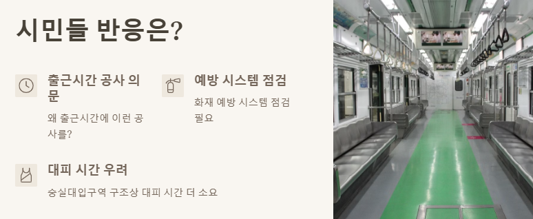 시민들은 “왜 출근시간에 이런 공사를 하는가”, “화재 예방 시스템 점검이 필요한 시점”, “숭실대입구역 구조상 대피에 더 많은 시간 소요”라는 반응을 보이며, 보다 근본적인 대책 마련을 요구하고 있습니다.