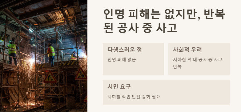 이번 숭실대입구역 화재는 다행히 인명 피해 없이 마무리되었지만, “지하철 역 내 공사 중 사고 발생”, “용접 작업 중 화재 위험”, “서울 지하철 안전관리 미흡” 등의 키워드로 사회적 우려가 커지고 있습니다. 특히, 최근 몇 년 사이 반복적으로 지하철 역사 내 공사 중 연기나 화재가 발생하면서 “지하철 작업 안전 강화 필요”라는 목소리가 거세지고 있습니다.