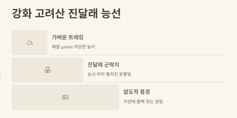 운동을 겸해서 봄 풍경을 즐기고 싶다면 강화 고려산을 추천해요. 해발 400m 정도라 가벼운 트레킹에 안성맞춤이고, 능선을 따라 이어지는 진달래 군락지는 정말 압도적인 풍경을 자랑합니다. 수도권 봄나들이 갈만한곳 중 자연에 흠뻑 젖고 싶다면 이곳이 정답이죠.