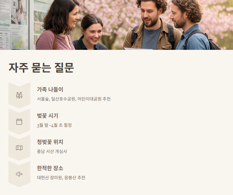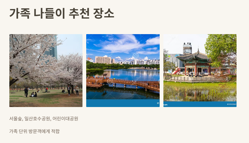 서울숲, 일산호수공원, 어린이대공원 등 가족 단위 방문객에게 좋은 장소가 많아요.
