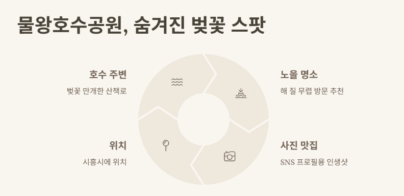 시흥에 위치한 물왕호수공원은 이름처럼 호수 주변으로 벚꽃이 만개해서 산책하기 정말 좋아요. 특히 해 질 무렵 노을과 벚꽃이 어우러지는 시간은 사진 맛집으로도 유명하죠. 저도 그때 찍은 사진으로 SNS 프로필을 바꿨을 정도랍니다.