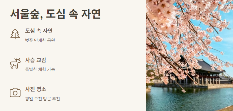 수도권에서 봄나들이 갈만한곳을 찾는다면 가장 먼저 떠오르는 곳은 바로 서울숲이에요. 도심 속에서 자연을 느낄 수 있고, 사슴과 교감할 수 있는 특별한 공간이기도 하죠. 특히 벚꽃이 만개한 서울숲은 평일 오전에 가면 사진 찍기에도 딱 좋은 조용한 분위기랍니다.
