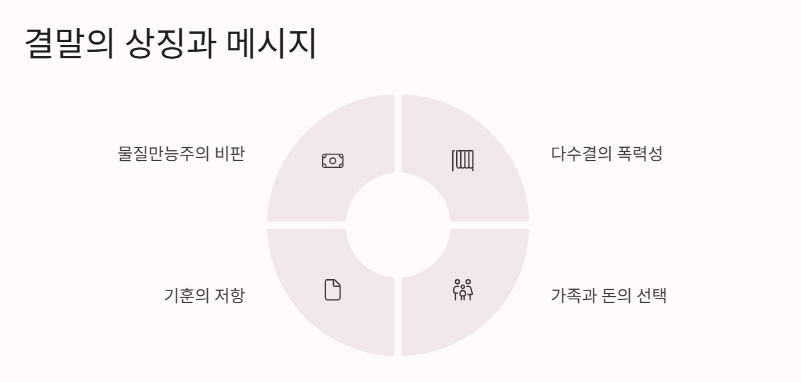 기훈의 자살은 시스템에 대한 저항, 명기의 행동은 극단적 선택의 아이러니로 해석돼요.