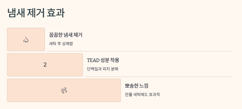 한 가지 더! 세탁기 돌리고 나서 남는 꿉꿉한 냄새 있잖아. 그게 이 쏙터블 쓰고 나서는 거의 안 나. TEAD 성분이 냄새 원인인 단백질이나 피지를 분해해준다니까 그럴만도 하고. 찬물 세탁인데도 뽀송한 느낌이 나서 완전 신세계였음.