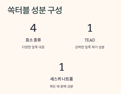 시중의 일반 표백제들은 대부분 과탄산소다만 써서 찌든 때에 약한 경우가 많아. 그런데 쏙터블은 TEAD 성분에다가 세스퀴 나트륨, 그리고 4가지 다른 효소가 들어있어서 음식물, 땀, 기름 때 같은 다양한 얼룩에 전부 대응이 가능해. 그래서 그런지 일반 세제보다 확실히 강력한 세척력 체감됐어.