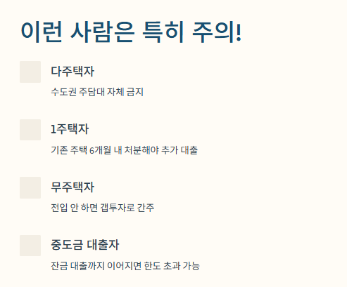 - 다주택자: 수도권에서는 이제 주담대 자체가 금지됨