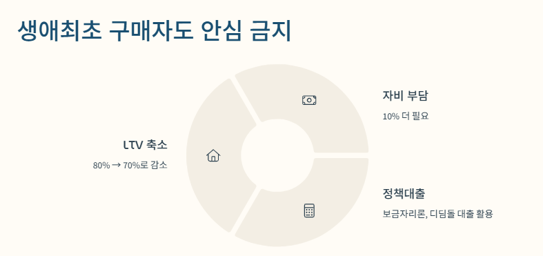 이게 제일 어이없었던 게, 생애최초 주택 구입자도 LTV 70%로 줄었어. 원래 80%였는데, 이젠 10% 더 자비로 넣어야 하니까 부담이 크지. 그래도 보금자리론이나 디딤돌 대출 같은 거 활용하면 좀 도움은 돼. 물론 한도도 줄었지만…