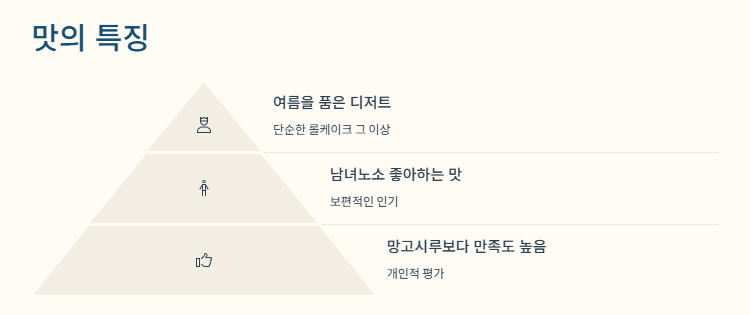 망고시루는 비주얼이 화려하고, 망고롤은 맛이 더 풍성해요. 개인 취향 따라 달라요!