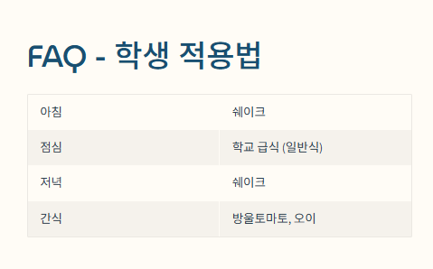 학교 급식 일정 고려해서 점심은 일반식, 아침+저녁은 쉐이크로 조절하면 좋아요.