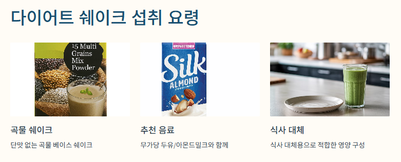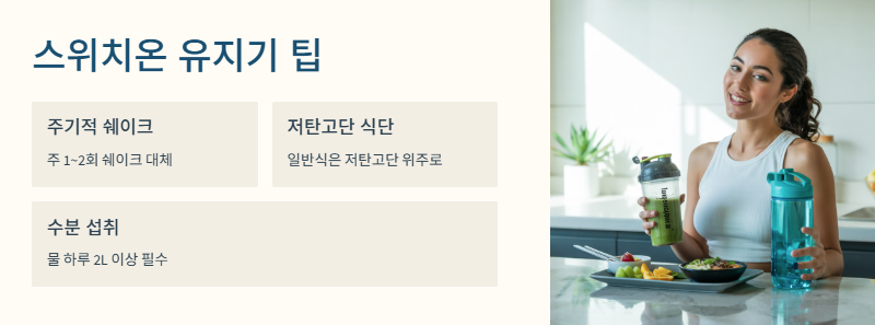 - 식단 중간에 쉐이크 두 끼, 하루 한 끼 일반식 유지