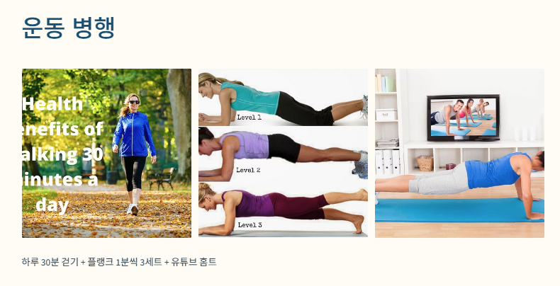 저는 하루에 30분 걷기 + 플랭크 1분씩 3세트 정도 했어요.