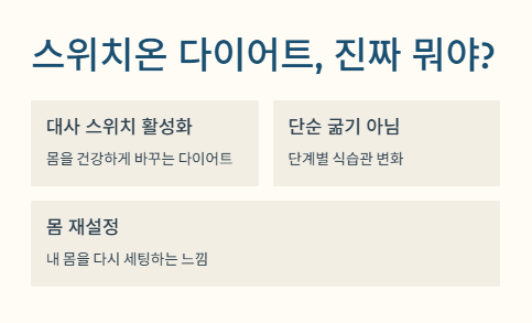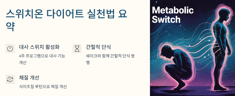 쉽게 말하면, 대사 스위치를 켜서 몸을 건강하게 바꾸는 다이어트예요. 그냥 굶고 빠지는 다이어트가 아니라, 단계별로 식습관을 바꾸면서 내 몸을 다시 세팅하는 느낌이랄까?