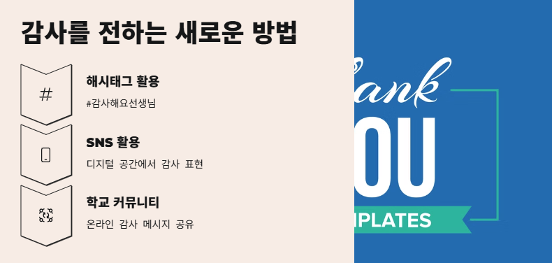 온라인 시대에 맞게, SNS나 학교 커뮤니티를 활용한 감사 표현도 점차 확산되고 있습니다. 예를 들어, ‘#감사해요선생님’ 해시태그를 활용해 디지털 공간에서도 감사의 마음을 표현하는 방법이 인기를 끌고 있습니다. 이러한 방법은 특히 디지털 세대에게 더 친숙하고 효과적인 방법일 수 있습니다.