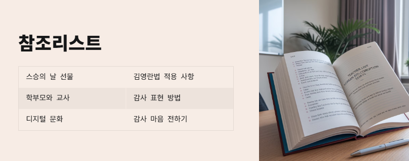 제가 개인적으로 추천하는 선물은 소박하지만 의미 있는 것입니다. 예를 들어, 학생들이 자발적으로 준비한 손편지나 그림은 법적으로도 문제가 없으며, 무엇보다 선생님께 큰 감동을 줄 수 있습니다. 물론, 꽃이나 커피 기프티콘도 좋지만, 학생들의 진심이 담긴 편지나 감사 메시지가 더 큰 의미를 갖습니다.