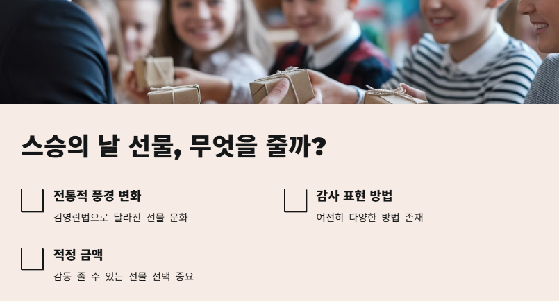 스승의 날 선물을 선택하는 것은 단순히 선물을 고르는 것 이상의 고민을 필요로 합니다. 전통적으로 학생들이 선생님께 꽃을 드리거나 작은 선물을 하던 풍경은 이제 김영란법에 의해 많이 달라졌습니다. 그럼에도 불구하고, 여전히 감사의 마음을 표현할 수 있는 방법은 많습니다. 예를 들어, 적당한 금액 내에서 감동을 줄 수 있는 선물을 선택하는 것이 중요합니다.