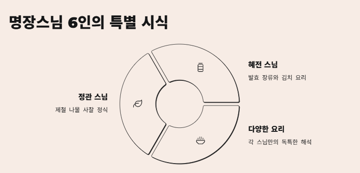 각 스님은 자신만의 독특한 방식으로 사찰음식을 해석하고, 그 맛을 대중에게 전하려 합니다. 예를 들어, 정관 스님은 제철 나물로 구성된 사찰 정식을 선보이며, 혜전 스님은 발효 장류와 김치 요리를 통해 전통 발효의 지혜를 나눕니다. 이외에도 다양한 요리가 시식 코너에서 제공될 예정입니다.