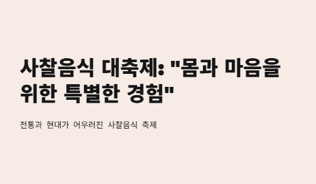 이번 대축제에서는 그동안 잘 몰랐던 사찰음식의 깊은 의미와 맛을 제대로 체험할 수 있는 기회가 될 것입니다. 건강을 챙기고 마음의 평화를 찾고 싶은 분들, 그리고 새로운 음식 문화를 경험하고 싶은 분들에게 사찰음식 대축제는 더할 나위 없이 좋은 선택이 될 것입니다.