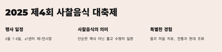 2025년 6월 7일부터 8일까지 서울 양재 aT센터 제1전시장에서 제4회 사찰음식 대축제가 열립니다. 이 행사에서는 전통적인 사찰음식뿐만 아니라, 다양한 문화 행사와 체험 프로그램이 준비되어 있어 관람객들에게 깊은 인상을 남길 것입니다.