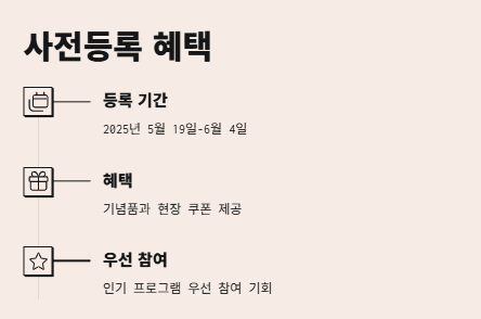 공식 홈페이지에서 신청서를 작성하면 됩니다. 예약 기간은 2025년 5월 19일부터 6월 4일까지입니다. - 사전예약 없이 현장 참여가 가능한가요?