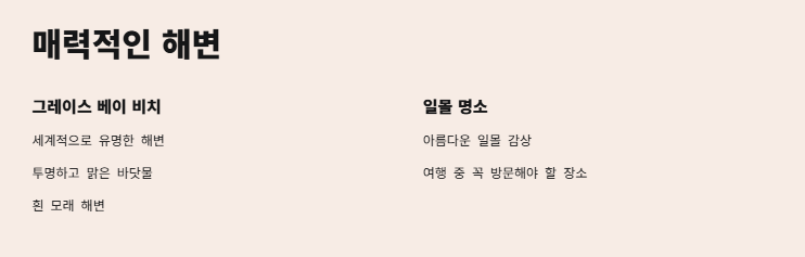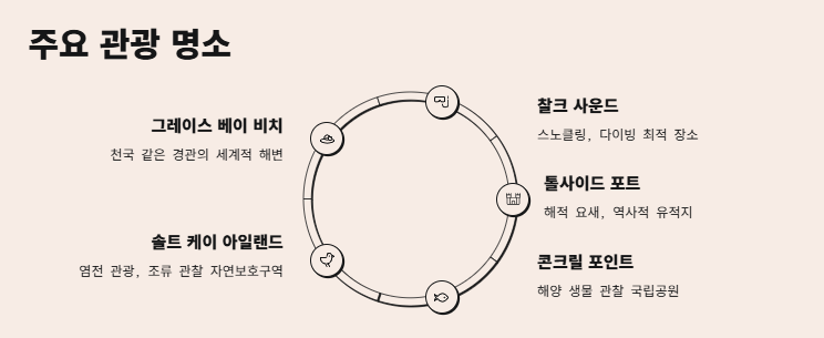 - 그레이스 베이 비치는 세계적으로 유명한 해변으로, 투명한 바다와 하얀 모래가 매력적입니다.