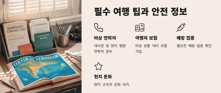 - 현지 문화 이해: 현지 규칙과 문화를 숙지하여 원활한 여행을 준비하세요.