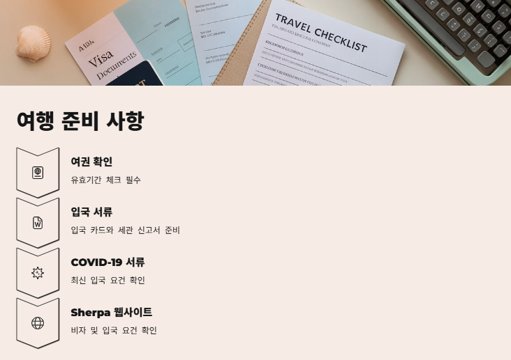 여행 준비를 위해서는 여권 유효기간을 체크하고, 입국 카드와 세관 신고서를 준비해야 합니다. 또한, COVID-19 관련 서류도 확인해야 하며, 최신 입국 요건에 맞는 준비가 필요합니다. 여행 전, Sherpa 웹사이트에서 비자 및 입국 요건을 확인하는 것이 좋습니다.