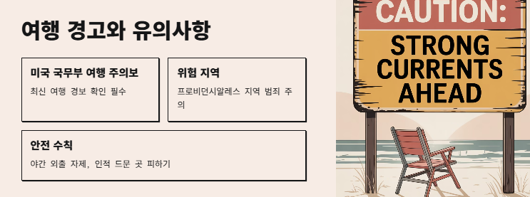 최근 미국 국무부는 터크스 케이커스 제도에 여행 주의보를 발령했습니다. 섬의 일부 지역에서 범죄 발생 가능성이 높기 때문에, 여행 전에는 최신 여행 경보와 안전 정보를 꼭 확인해야 합니다. 특히, 프로비 던 시알레스 지역에서는 범죄가 발생할 수 있으니 주의가 필요합니다. 안전한 여행을 위해 야간 외출을 자제하고, 인적이 드문 곳은 피하는 것이 좋습니다.