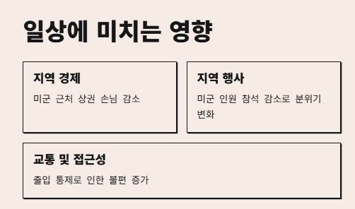 미군 인근 지역 주민이나 상권에는 간접적인 영향을 줄 수 있습니다. 교통 통제나 행사 제한 등이 그 예입니다.