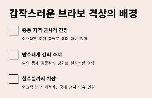 근데 이번엔 철수가 아니라 오히려 ‘방호 강화’ 쪽이 더 강한 분위기야. 다만, 브라보 단계가 지속되면 국민들 사이에서 불안감은 커질 수 있고, 일부 매체에서는 ‘혹시 철수 준비 아니야?’라는 식으로 해석하기도 하는 거 같아.