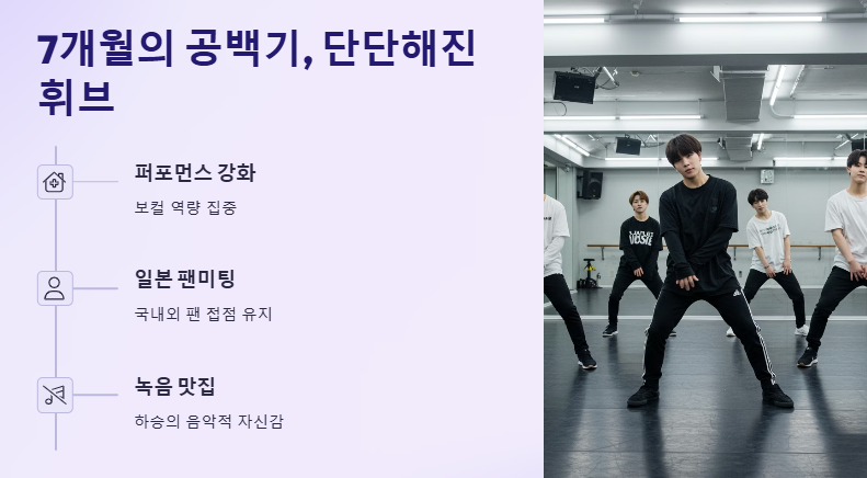 지난 7개월간 휘브는 단순한 휴식을 취하지 않았다. 퍼포먼스와 보컬 역량 강화, 일본 팬미팅 등 국내외 팬들과의 접점을 이어가며 완성도를 높여왔다. 인홍은 “팬들의 응원이 있었기에 공백 같지 않은 시간이었다”고 말했고, 하승은 “이번 앨범으로 ‘녹음 맛집’이라는 소리를 듣고 싶다”며 음악적 자신감을 드러냈다. 이 역시 팬들 사이에서 “휘브 컴백 무슨 일이야, 확 달라졌네”라는 반응을 이끌어냈다.
