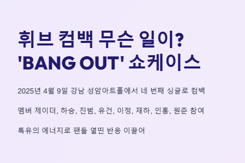 그룹 휘브(WHIB)가 2025년 4월 9일, 서울 강남 성암아트홀에서 열린 쇼케이스를 통해 네 번째 싱글 ‘BANG OUT’으로 컴백했다. 이번 무대는 휘브 특유의 에너지를 압축해놓은 듯한 퍼포먼스로 현장을 압도했으며, 팬들의 열띤 반응이 쏟아졌다. 쇼케이스에 참여한 멤버 제이더, 하승, 진범, 유건, 이정, 재하, 인홍, 원준은 ‘휘브 컴백 무슨 일이야?’라는 질문에 답을 던지듯 강렬한 존재감을 발산했다.