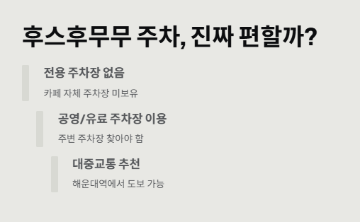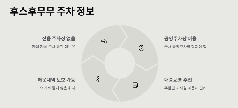 여기서 제일 중요한 건 바로 후스후무무 주차 문제! 후스후무무 카페 주변이 해운대 중심이라 그런지 주차가 빡세요... 일단 전용 주차장이 따로 있는 건 아니고, 근처 공영주차장이나 유료주차장 이용해야 돼. 나도 돌아돌아 겨우 빈자리 찾았거든. 그래서 다음엔 지하철 타고 올까 생각 중. 해운대역이랑 그렇게 멀지 않아서 대중교통도 나쁘지 않아!