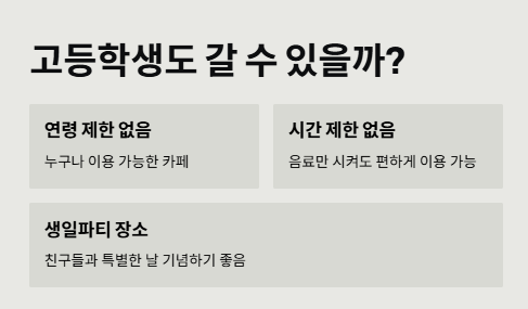 완전 가능! 후스후무무는 카페다 보니까 음료만 시키면 시간제한 없이 편하게 앉아있을 수 있어. 공부하다가 잠깐 쉬러 가기도 좋고, 친구 생일파티 장소로도 완전 추천할 수 있어. 나도 친구 생일 맞춰서 꾸미고 같이 갔는데, 좋은 추억으로 남았어.