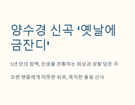이러한 스토리와 연결된 신곡 ‘양수경 신곡 옛날에 금잔디’는 단순한 음악 발표를 넘어 진심을 전하는 메시지로 받아들여지고 있다. 음악은 결국 삶의 기록이자 이야기임을 다시금 느끼게 한다.