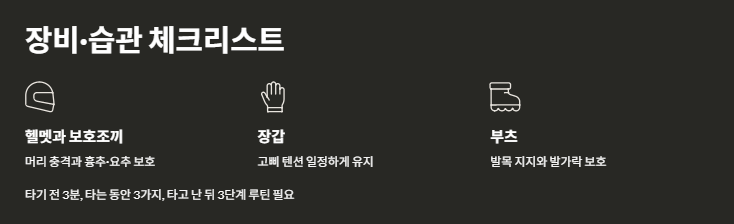 A. 헬멧·보호조끼·장갑·부츠는 필수. 타기 전 3분 점검(말 컨디션, 장비, 코스 브리핑)을 습관화하자.