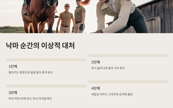 A. 일단 굴러나와 말과 거리 확보 → 머리/허리/어깨 통증·어지럼 체크 → 스태프와 재탑승 여부 결정 순서가 안전하다.