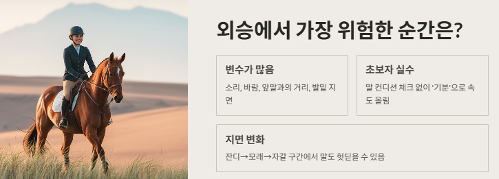 A. 초보자는 실내마장·저속 코스를 추천. 외승은 시야와 소리에 민감하므로 안전 우선으로 일정 조정이 바람직하다.